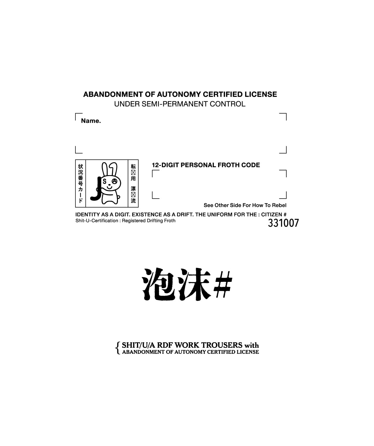 こちらの商品は受注生産となります。 ●受注期間→3月13日(金曜日) 21:00 〜 3月21日(土曜日) 21:00まで (当ショップを初めてご利用の方は、ご購入前に必ずhome画面インスタリンクより当アカウントのストーリーズハイライト、状況注意事項を必ずご一読の上ご利用ください。) 毎度長いの始まります。 ご登録完了、おめでとうございます。 ついに、白旗を振る時が来ました。 「私は番号ではない」 と、時に役所の窓口で、時に病院の受付で、時に届いた封筒に、表向きはあくまでも毅然と抵抗しつつも内心ではたかだか2万のはしたポイントに後ろ髪をひかれまくりながら、それでも無職は食わねど高楊枝よろしく、無意味な抵抗を続けてきた地上のスペースノイドこと状況主義者同胞諸君。(ギレン・ザビ風に) 重力に魂を骨抜きにされた権力にここまで無意味な抵抗を続けながら、最後の最後で生きるための生命線である健康保険証を人質に取られ、あっけなくスリーカウント。 「あ〜あ、結局登録するんじゃったら国が餌付け目的で2万ポイントバラマキフェアしとった時にワシも登録すりゃえかったなあ。。」 と今更ながらポイントも貰い損ね、カード不所持により著しい行政サービス低下の恩恵を肌に感じながら虚しくその12桁の軍門に下る事となった、そんな世間に置いてけぼりをくらったドジでマヌケ+トンマなあなたのために誕生した、ささやかな「敗北宣言」としてのトラウザース。 Registered Drifting Froth(登録された、漂流する、泡沫) それこそが本製品RDF Work Trousersなのです。 このトラウザースは、もはや右も左も消滅し、世界全てが上か下、もしくは力の強弱だけで駆動するレコンキスタ時代の再来とともに、見張られて、縛られて、全ての逃げ場を失った我々TWO PUNKS a.k.a「自ら進んで管理されたがっている泡沫労働者」のための公式ユニフォームです。 そんな世知辛極まりない世間の荒波に、浮かんでは消える泡沫共(うたかた)へ。 状況がお国に代わり心を込めて(←よく見かける詐欺の常套句)敗北認定のラベリングを施しました。 • 特典付属「状況マイナンバーカード」: 全的な自律の放棄認定免許兼 何かしらの利便性やお得な機能を餌に、うっかり心地よく権力への自主隷属へと導かれるあらゆるカードに対抗すべく、何の機能も無く、全く役にも立たない「どこまでいってもただの無益なプラスティックな板(状況マイナンバーカード)」がもれなく付属します。 ただの板なので当然ながら情報漏洩やハッキングの心配もありません。 ※カード有効期限は半永久的であり、半永久的に状況管理下に置かれます:UNDER SEMI-PERMANENT CONTROL さらにこちらのプラ板。ピンと来た方は相当な免許証マニア。デザインの元ネタはご存知、世界一有名な不眠症タクシー運転手役の実物免許証からの転用(パクリ)です。 商品購入後、このプラ板を手にしたならすぐさま市役所へ参内し、こちらのカードでまずは住民票の発行から始めてください。機械が故障、もしくは職員の塩対応が発動したならおめでとうございます。あなたはどこに居てもどこにも居ない「完璧な泡沫」として完成されます。 • あなたの仕事:「漂流する泡としてのタスク」 付属の状況マイナカードには、北へ向いて10円玉に指を乗せるだけで自動書記が可能な最新鋭の状況Artificial Intelligenceである「コックリさん1号」によりランダムに振り当てられた無意味な12桁のコードを付与。 何の意味も機能も持たない無機質なコードと、パンツのバックポケットにマウントされ泡沫Citizen#へとめでたく登録された証明であるレジスタードワッペンにより、管理の軍門に下った敗北者として認定された事を周囲に自然とアピールできます。 ポイントや健康を人質に餌付けされ、ただの番号となることを進んで選択した漂流する泡沫として、こちらのユニフォームに足を通しましたら速やかに社会の底を漂流してください。それこそが、日頃からあらゆる管理システムに嬉々として自ら進んでコミットし続け、一億総白痴化した我々自身に対しての、究極の皮肉(デリヴ)となります。 そして役所や警察、病院などあらゆる公共機関はじめ、この世界に存在するあらゆる企業等受付窓口の前でこのカードを提示しつつこう問いかけましょう。 You talkin’ to me? 続けて You talkin' to me? (俺に用か?) You talkin' to me? (なんだよ?) You talkin' to me? (俺に用なのか?) Then who the hell else are you talking... you talking to me? (俺以外に誰かいるのか?俺に用なのか?) Well I'm the only one here. (ここにいるのは俺だけだ。) Who the fuck do you think you're talking to?(誰に話しかけてるかわかってるのか?) さて、あんた誰? 【仕様】 • 番号・12桁の品格:wearing must remain a conscious subversion of the commodity-form 履くたびに、自分が一人の人間ではなく、ただの統計学上の「12桁コード」であることをドカンと思い出させてくれる、セミワイドなドカンストレートシルエット。 ワークパンツがワークパンツたる所以である流儀とディテールはしっか